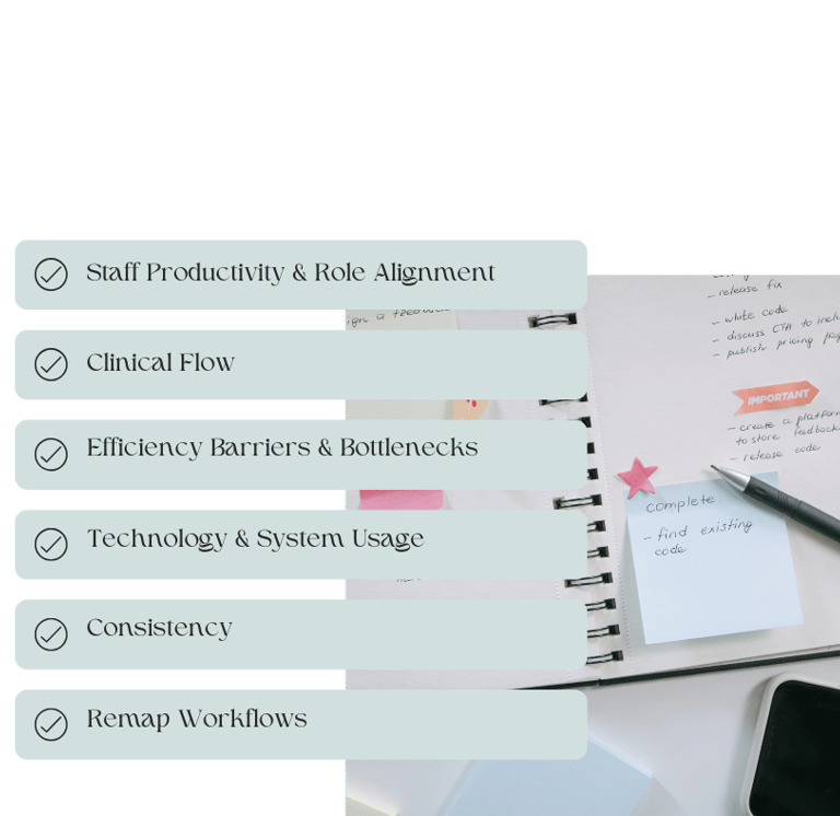 A Workflow Audit with Momentum Medical provides a clear, comprehensive look at how your practice functions day-to-day. Our team identifies efficiency barriers and bottlenecks, evaluates staff productivity and role alignment, reviews clinical flow, and assesses how well your technology and systems are being utilized. We also examine consistency across processes and uncover opportunities to streamline operations. The result is a fully remapped workflow designed to improve efficiency, support your team, and elevate the patient experience.
